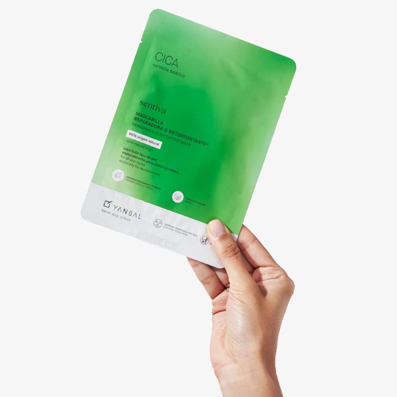 Una mascarilla de microfibra impregnada con un potente serum reparador y reconfortante que contiene centella asiática, especialmente creado para pieles sensibles. Un tratamiento cosmético intensivo de una sola dosis, para una piel luminosa y renovada, con un aspecto más sano.